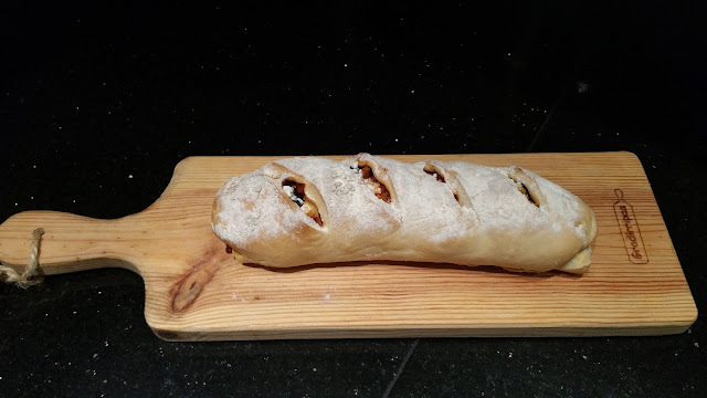 Distribuir o chouriço, linguiça e as azeitonas pela massa e enrolar, dar o acabamento final comas mãos e com uma faça bem afiada dar uns cortes em cima
